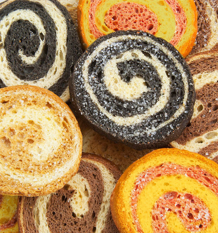 兩種麵糰揉製出陀螺紋路,切片烘烤並輕灑細緻晶糖。